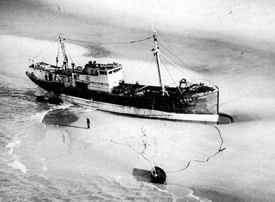 4 Dec 1950: In snow showers Gorleston and the Great Yarmouth tug Richard Lee Barber went to the help of the stranded Ostend trawler YARMOUTH on Scroby Sands, 3-4 miles off Gt. Yarmouth, but she was eventually abandoned. [The Times, Tuesday 5th December 1950.] See photograph below.